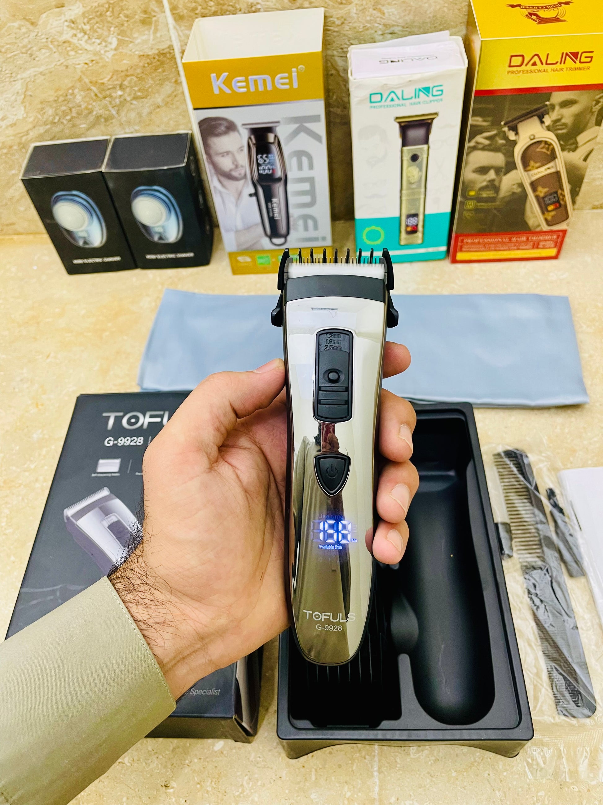 The Tofuls G-9928 is a professional all-in-one grooming trimmer with wide adjustment settings, extra combs, long battery life, and a smart digital display. Perfect for beard styling, shaving, and full hair cutting.